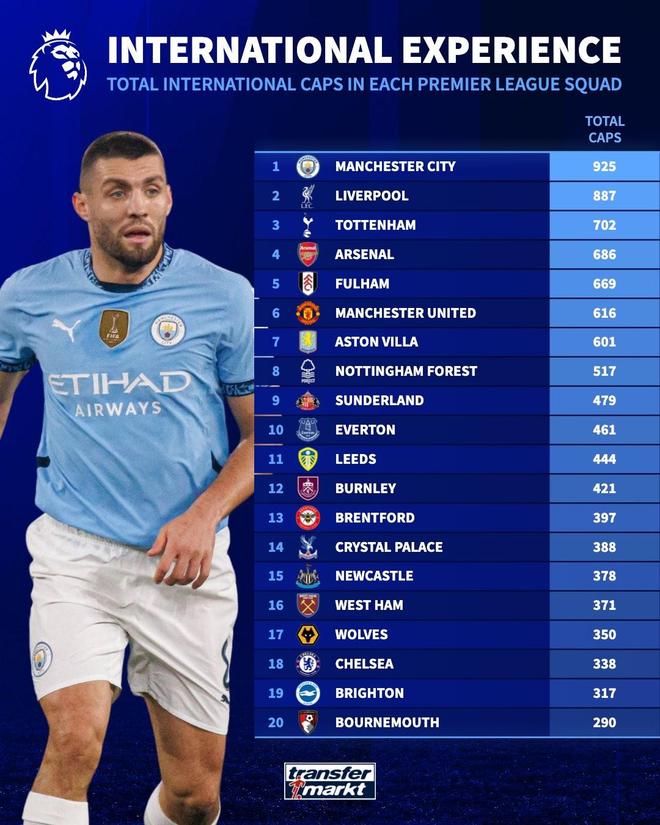 英超俱乐部球员国家队出场数榜:曼城、利物浦前2,切尔西第18