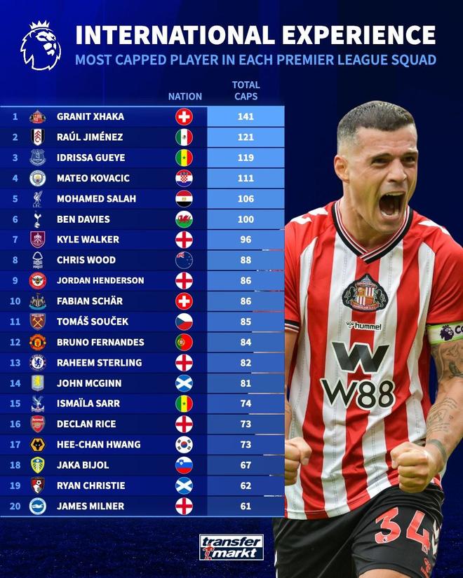 1. 桑德兰 扎卡(瑞士) 141场